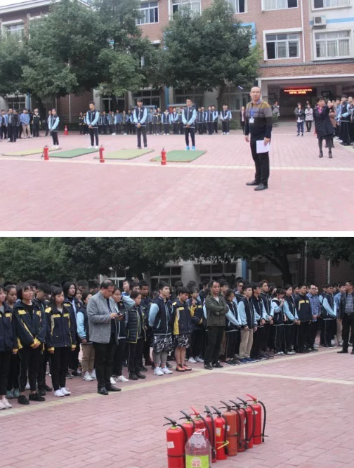 中國部·中學(xué)王校長到達(dá)場地中央,使用滅火器為大家模擬展示了一次滅火活動。