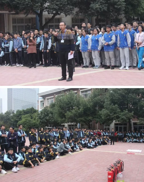 同時,由高中學(xué)子鄧時雨、覃玉恒、李昊和辜遠(yuǎn)騏組成的消防志愿者演示隊就如何打濕毛巾捂住口鼻、如何安全有序地進(jìn)行疏散、如何正確使用滅火器進(jìn)行了配合現(xiàn)場演示,幫助中學(xué)學(xué)子更加直觀、深刻地了解火災(zāi)常識。