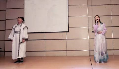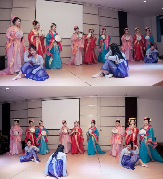 在娓娓而溫婉的朗誦聲中,九位初中語文老師身著唐時服裝,盛妝登臺,為同學們展現(xiàn)了朗誦的魅力。