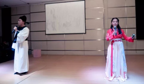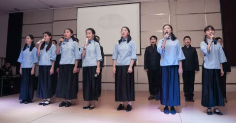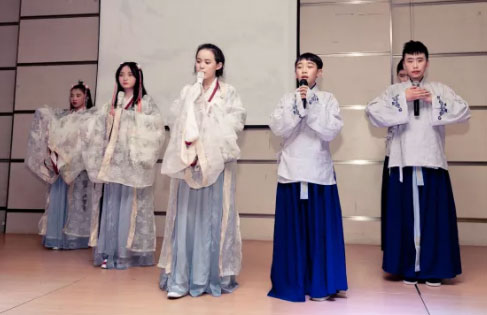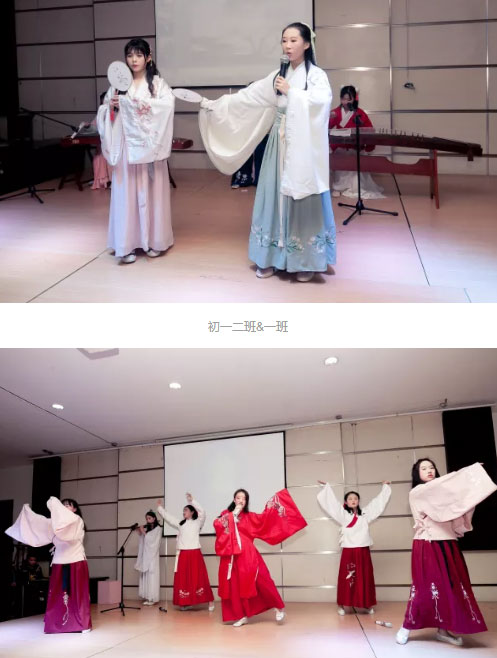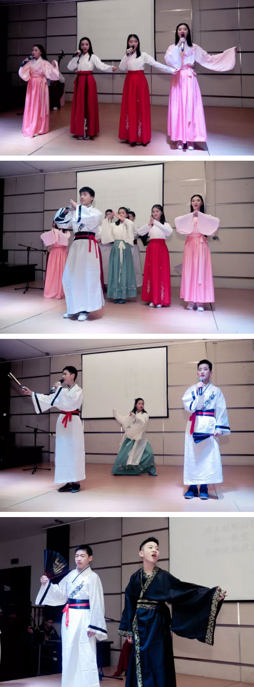 初一一和二班未我們帶來的則是蘇軾的《水調(diào)歌頭》,孩子們現(xiàn)場用古箏和二胡伴奏,令朗誦更加有聲有色。