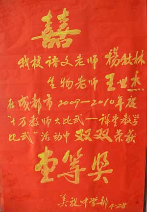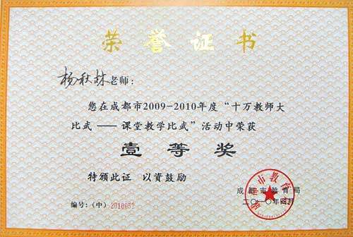 我校生物老師王世杰、語文老師楊秋林,兩人在成都市2009-2010年度“十萬教師大比武——課堂教學比武”活動中同登榜首,雙雙榮獲壹等獎。為校爭榮光,為同仁立楷模。