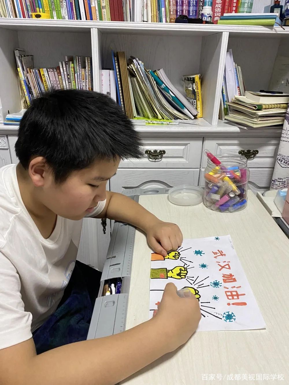 基于疫情的項(xiàng)目式學(xué)習(xí),以學(xué)科統(tǒng)整的形式,引導(dǎo)美寶科學(xué)認(rèn)識(shí)疫情,懂得感恩、擔(dān)當(dāng)與責(zé)任,珍惜生命。孩子們通過(guò)繪畫(huà)、手工、創(chuàng)作樂(lè)曲等形式,積極為防控疫情助力吶喊。