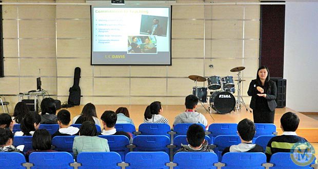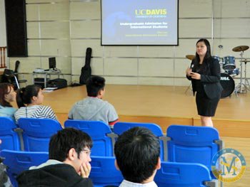 2012年10月24日,美國(guó)加州大學(xué)戴維斯分校主管中國(guó)及香港地區(qū)本科招生的招生官李屏姍女士應(yīng)邀到美視項(xiàng)目部為同學(xué)們做了一場(chǎng)關(guān)于申請(qǐng)美國(guó)加州大學(xué)戴維斯分校的招生講座。