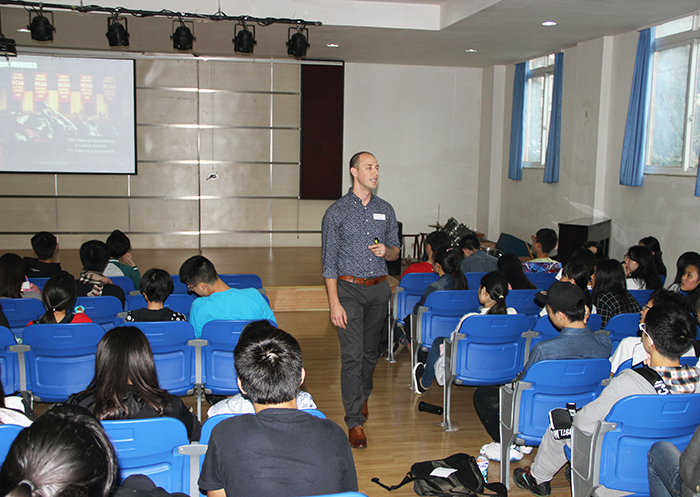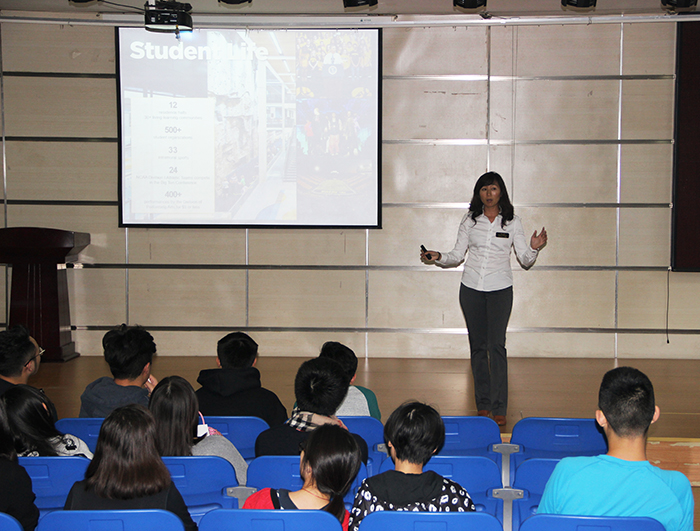 招生官們分別代表各自的大學(xué)在我校融合部禮堂為融合部高中生們做了大學(xué)簡介,同時介紹了大學(xué)招生政策。他們還用視頻資料向同學(xué)們展示了大學(xué)的地理位置、內(nèi)外環(huán)境以及各所大學(xué)的特色。他們把大學(xué)申請卡發(fā)給同學(xué)們讓大家填寫自己的信息及聯(lián)系方式。之后,他們回答了同學(xué)們的疑問,同時也問了同學(xué)們一些問題。據(jù)他們介紹,他們所代表的大學(xué)對IB學(xué)子都有專門的傾斜性錄取政策。優(yōu)秀的IB學(xué)子可以用他們HL course(高級課程)的成績在大學(xué)一年級換取學(xué)分。之前,很多9-11年級學(xué)生對他們以后要申請的大學(xué)沒什么概念。聽了四位大學(xué)招生官的介紹,很多同學(xué)開始為自己設(shè)定目標(biāo)。他們明白,他們必須非常努力地學(xué)習(xí)才能進(jìn)入夢寐以求的大學(xué)。