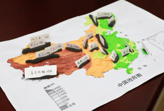 同學(xué)們需準(zhǔn)確繪制中國輪廓,用不同顏色黏土呈現(xiàn)三級階梯分布,標(biāo)注階梯界線、主要山脈和地形區(qū)。從青藏高原至長江中下游平原,地勢變化在模型中清晰展現(xiàn)。