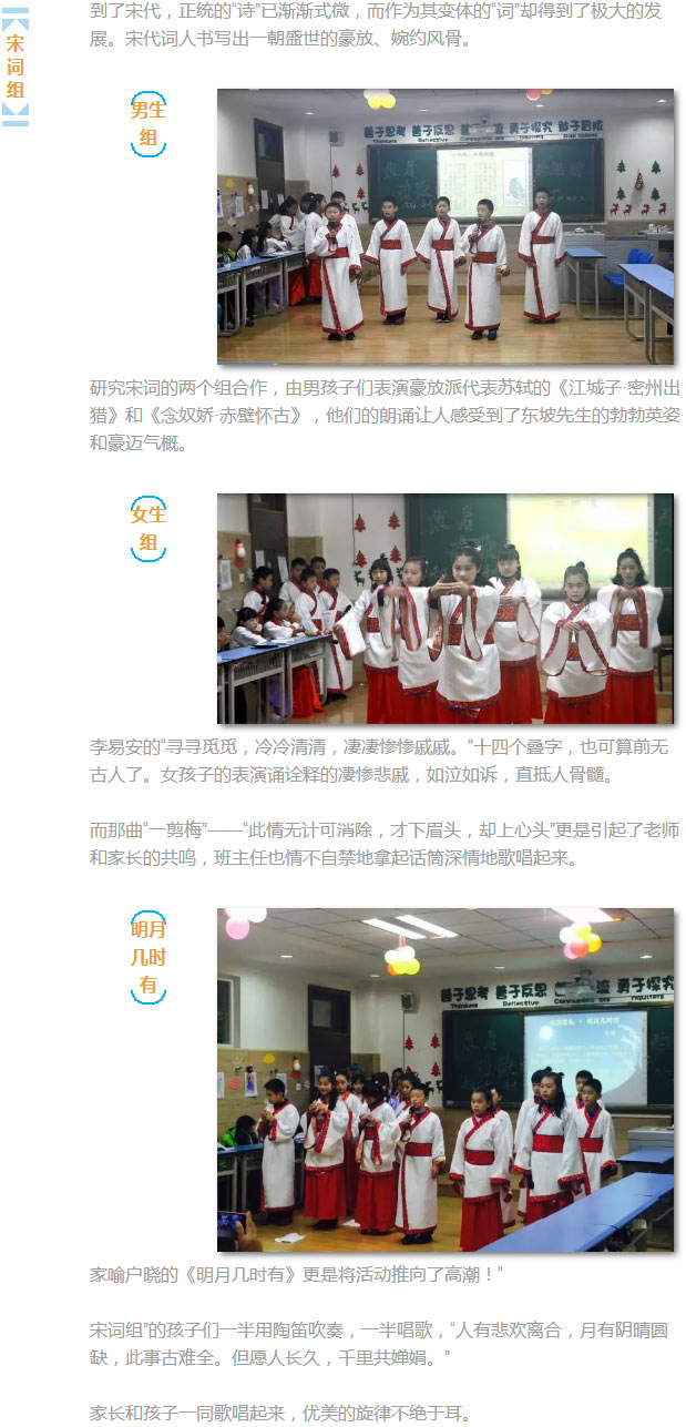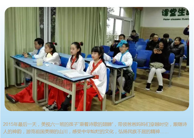 2015年的最後一天,在何老師的精心籌畫下,以“插上詩歌的翅膀”為主題的活動(dòng)為15年畫上了完美的句號(hào)。整個(gè)活動(dòng)的佈局安排精巧而合理,所有的孩子都成為了最棒的自己,他們以古詩的時(shí)間脈絡(luò)為軸,用吟誦、劇演、舞蹈等豐富的形式呈現(xiàn)了古詩的品與味、鑒與賞。最後的搶答環(huán)節(jié)更是激發(fā)了家長和孩子對(duì)古詩文的熱情與關(guān)注。細(xì)細(xì)體悟老師對(duì)活動(dòng)安排的用心,旨在當(dāng)代語言充斥著網(wǎng)路用語的環(huán)境下培植一方古詩文的文化土壤,浸潤出腹有詩書氣自華的孩子。不過,家長搶答環(huán)節(jié)提醒了我們,作家長的,如若希望孩子可以滿腹經(jīng)綸,那麼,我們就與孩子一起遨遊在這璀璨的文化裡,品味古詩文的精煉妙絕。