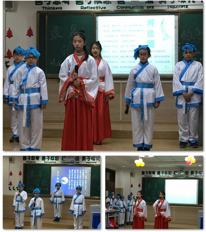 “李白組”的孩子們講解了李白的生平,并朗誦表演了《將進(jìn)酒》、《夢游天姥吟留別》和《月下獨(dú)酌》。