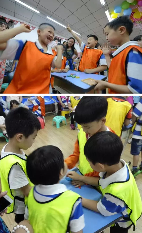 下午三點,家長們準時來到教室,孩子們抑制不住興奮,圍繞在爸爸媽媽身邊嘰嘰喳喳笑個不停,歡樂的氛圍已經(jīng)溢出了教室外?;顒娱_場,孩子們分成5個團隊,穿上不同顏色的背心,一下子小團隊之間的比賽氛圍就出來啦!