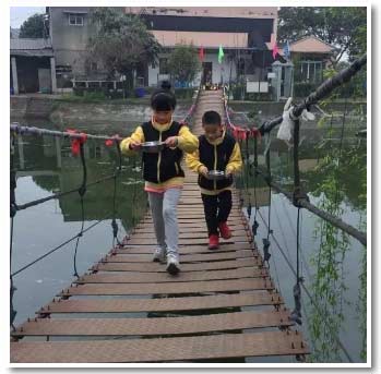 索橋運水中,看看哪個組運的又多又快!瞧,我們?nèi)菀讍幔?/span>