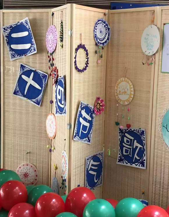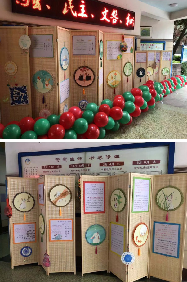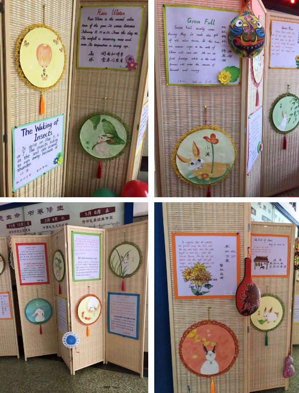 上面除了具有中國(guó)風(fēng)的掛畫(huà)外,還有全校英語(yǔ)老師們用英語(yǔ)和中文兩種語(yǔ)言親手書(shū)寫(xiě)的“二十四節(jié)氣歌”。