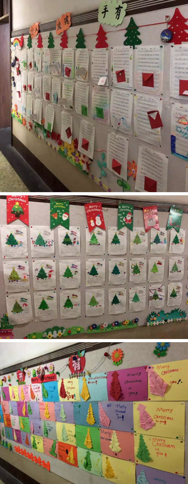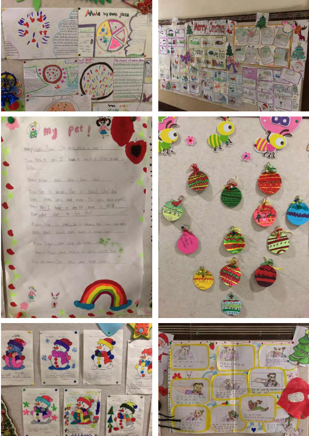 有高年級(jí)同學(xué)的“My Picture Book”、“Our Own Pizza”、“To San Claus”,也有低年級(jí)孩子的“Our Dialogue”、“My Christmas Tree”、“My Snow Man”,每一幅作品都是圖文并茂,美不勝收。