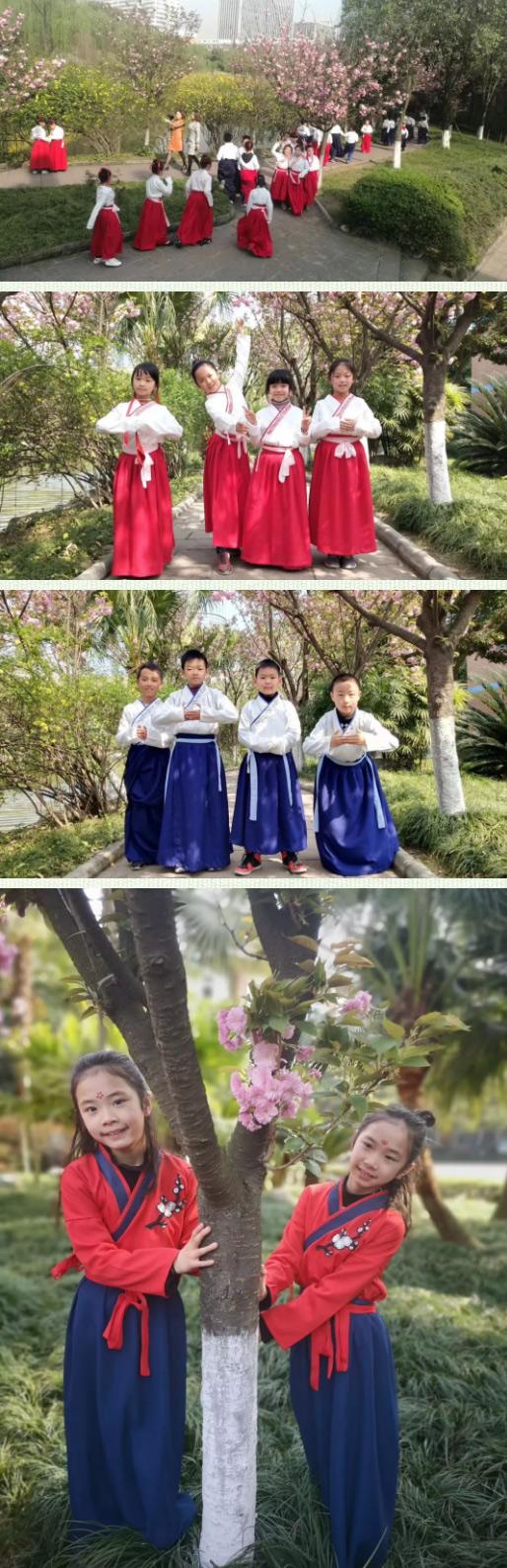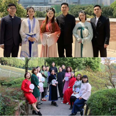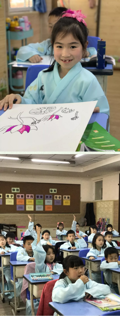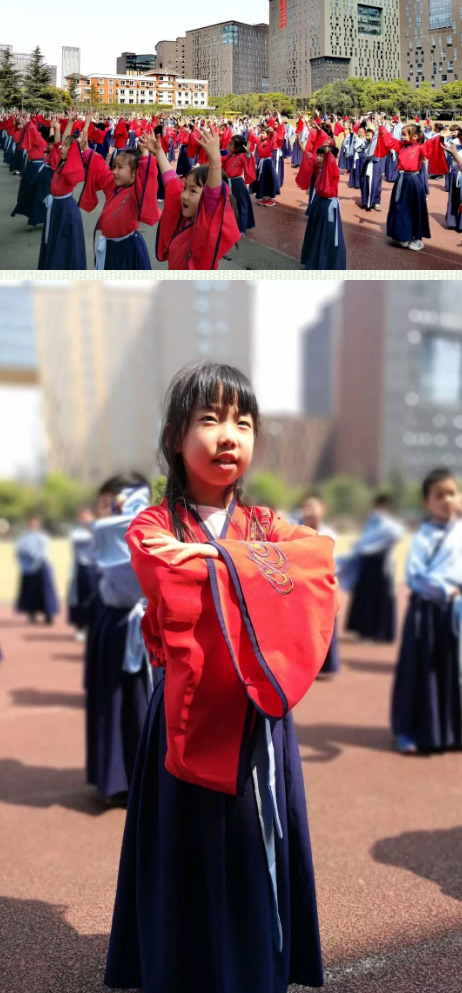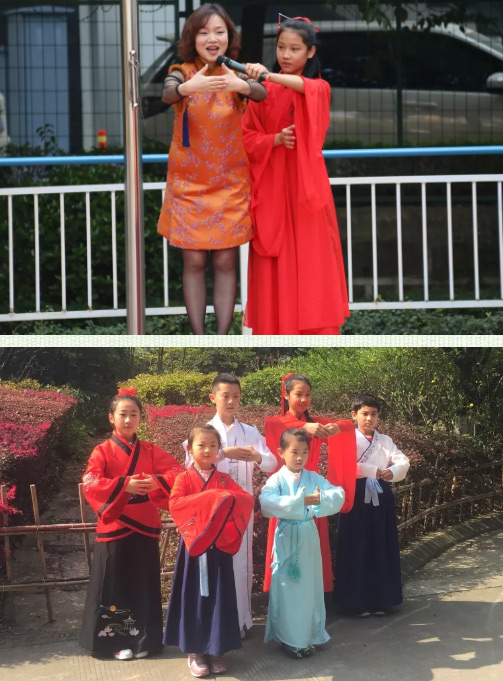 一年級的小朋友們穿上漂亮的漢服,時(shí)而誦,時(shí)而唱。伴隨優(yōu)美的動作翩翩起舞。