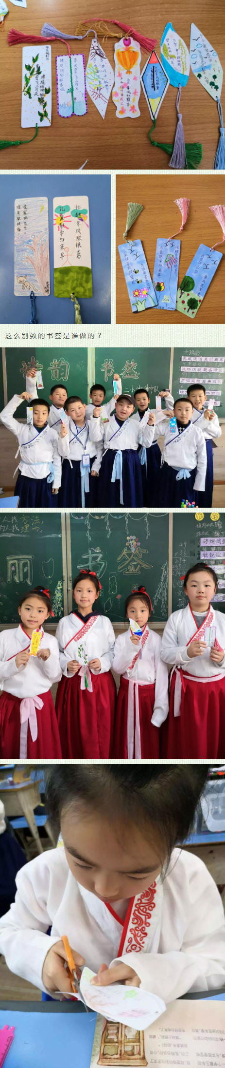 他們抄古詩,畫古詩,親手制作漂亮雅致的詩韻書簽。這一方小小的書簽,承載著他們一個(gè)大大的夢想:我們愛中華,我們是傳承人!