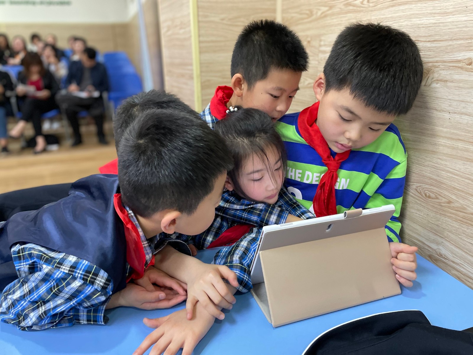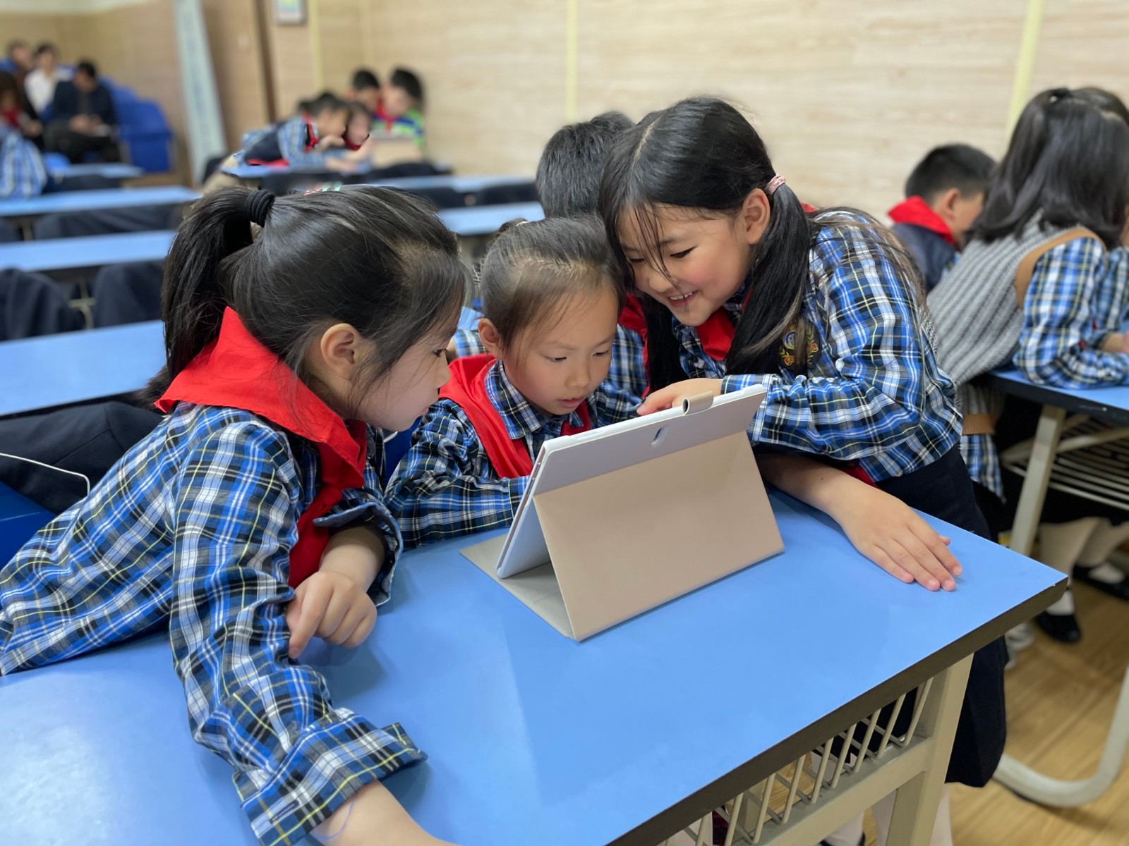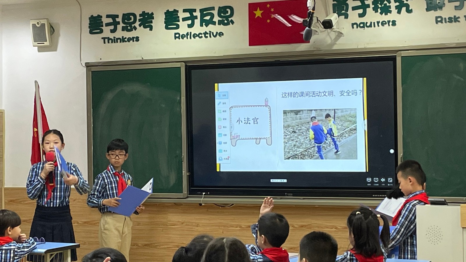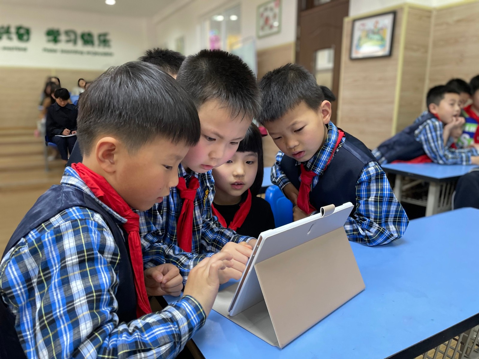 孩子們通過欣賞他們自己的課間視頻,觀察并分析哪些行為是安全的,哪些不安全。然后分小組討論:安全、文明,又快樂的課間休息,可以做些什么。這次活動還特別使用了“智慧課堂”的平板電腦功能,讓課堂的互動形式更有了多樣性。