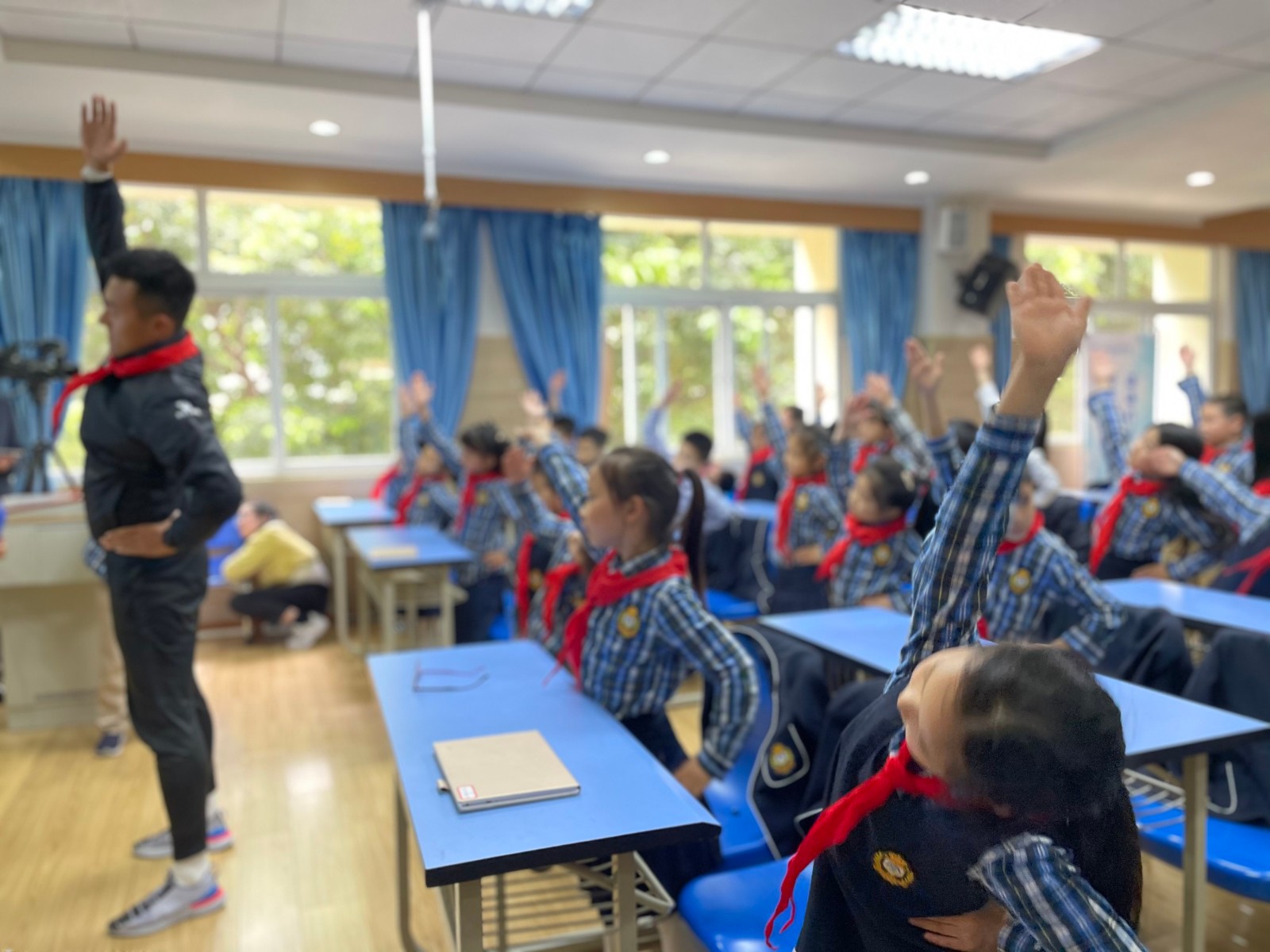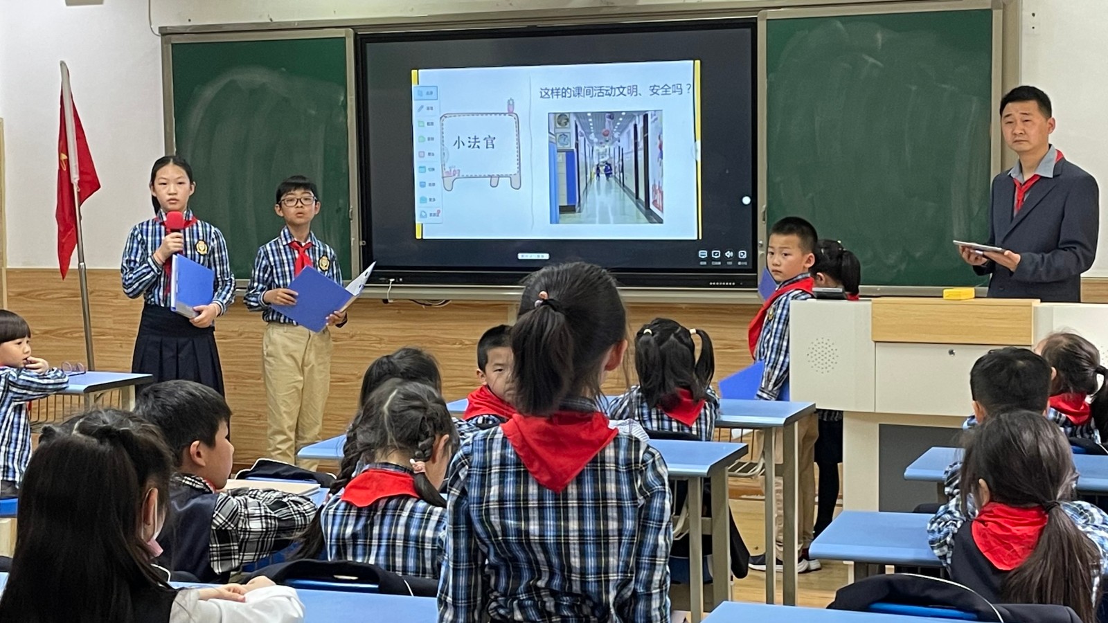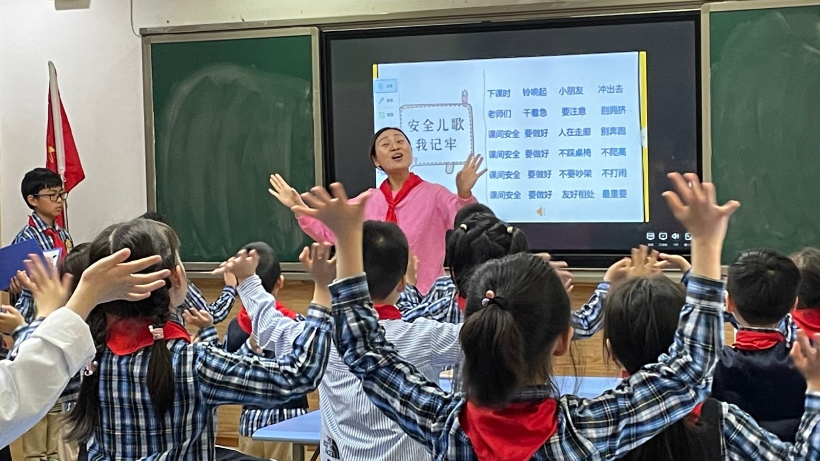 這節(jié)中隊活動課邀請了音樂學科、體育學科老師協(xié)作教學。讓小隊員學唱表演《安全兒歌我記牢》,學習在室內(nèi)進行做微運動,進行放松。