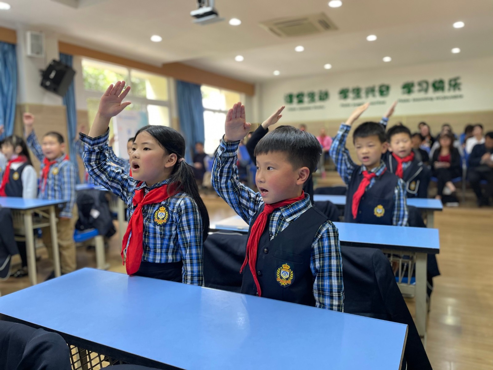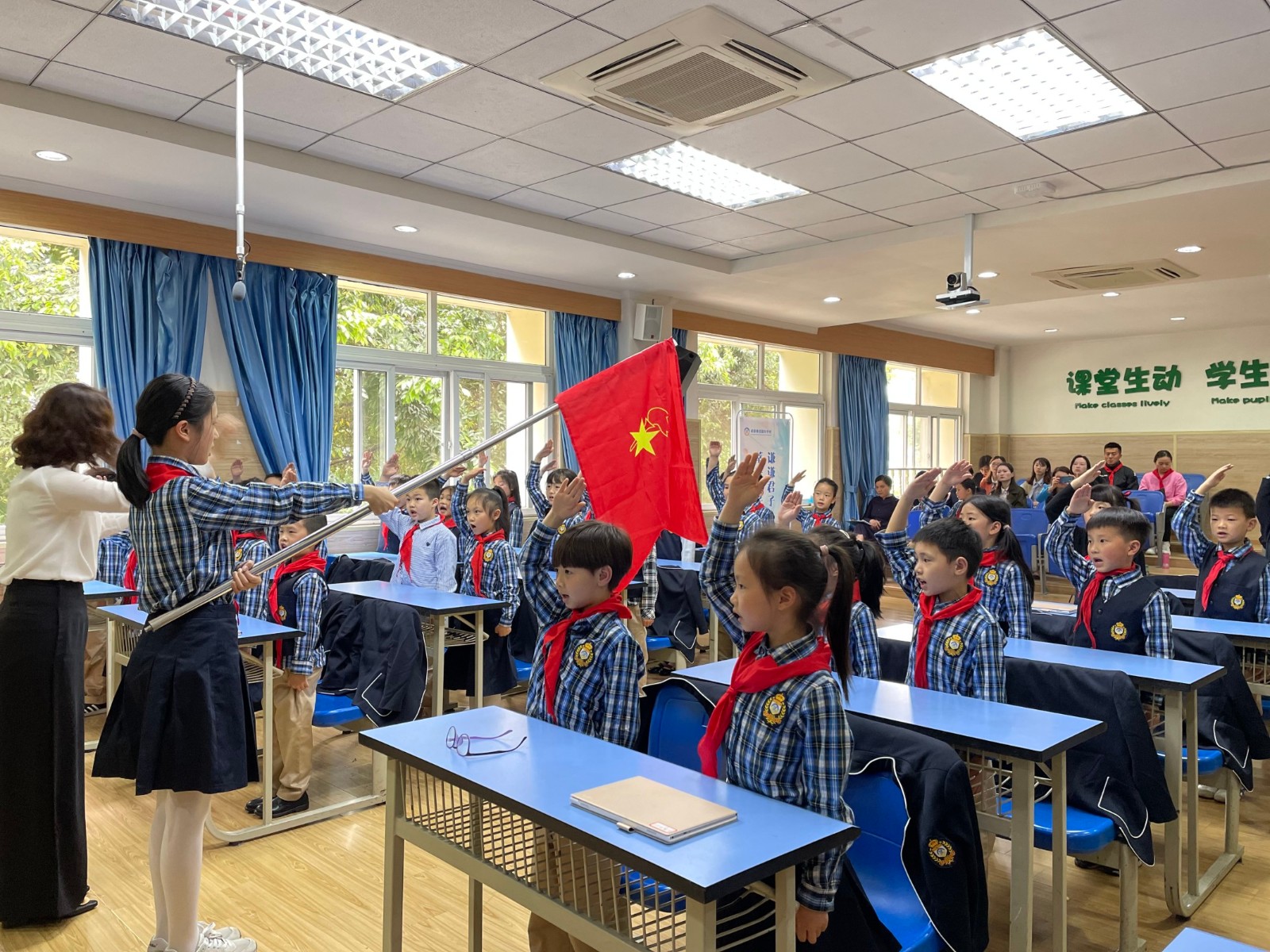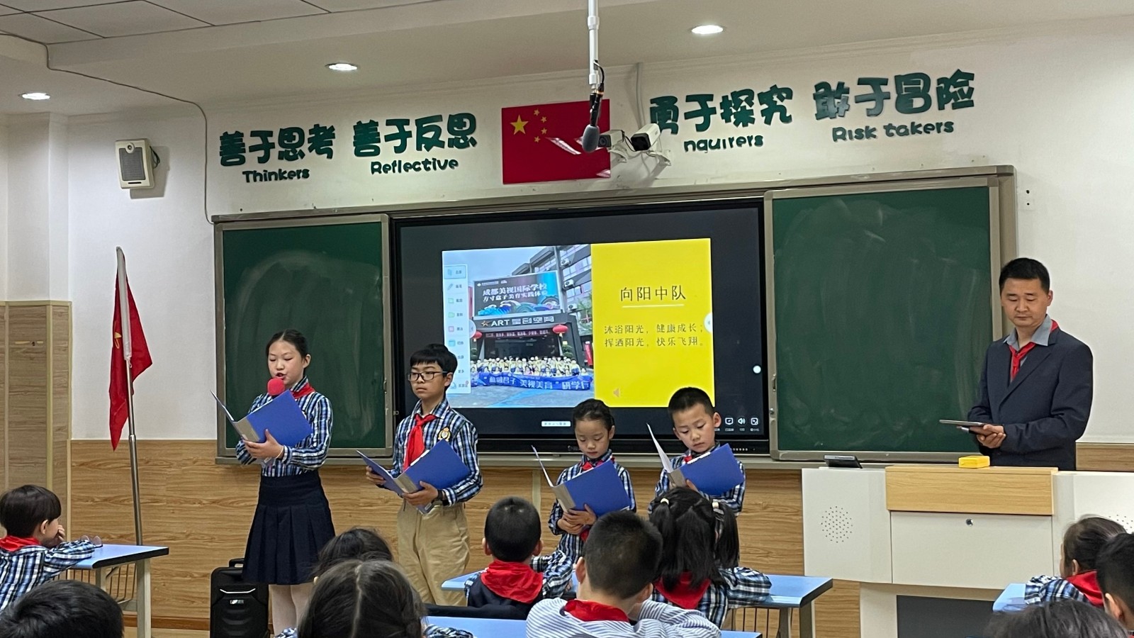 因為一年級孩子年齡較小,發(fā)揚美視“手牽手”的精神,由五年級(2)班的哥哥姐姐出旗,并帶領小主持們主持隊會。