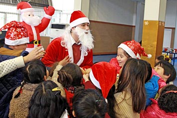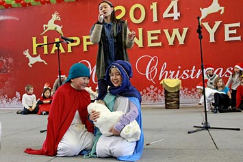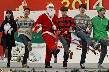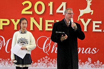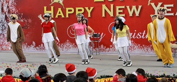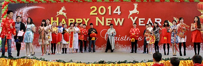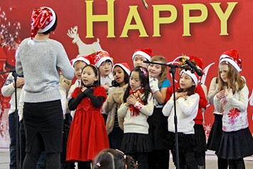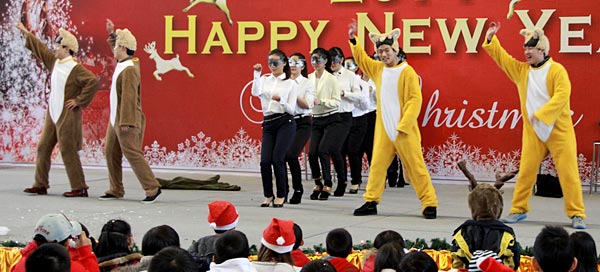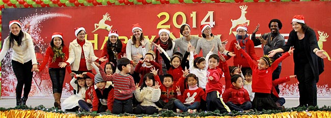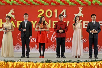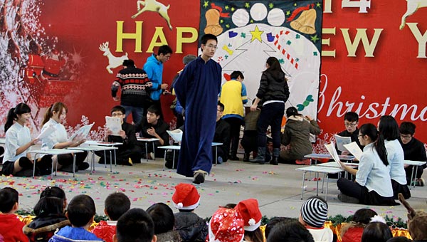 2013年12月20日,伴隨著圣誕頌歌的響起,美視項目部圣誕慶祝活動在學校體育館內舉行。體育館內被圣誕傳統(tǒng)顏色點綴得五彩繽紛,有常青、雪白、金銀色、藍白色等。演出現(xiàn)場大約有600名觀眾,包括學生、老師、家長。中、小學生在老師的帶領下高唱圣誕頌歌。表演的節(jié)目還包括樂隊、舞蹈、鼓樂、合唱等。節(jié)目結束后,“圣誕老人”上場。孩子們立即涌向“圣誕老人”并索要糖果。同時,圣誕慶?;顒拥酱巳拷Y束。師生們將度過一個愉快的圣誕、元旦假期。