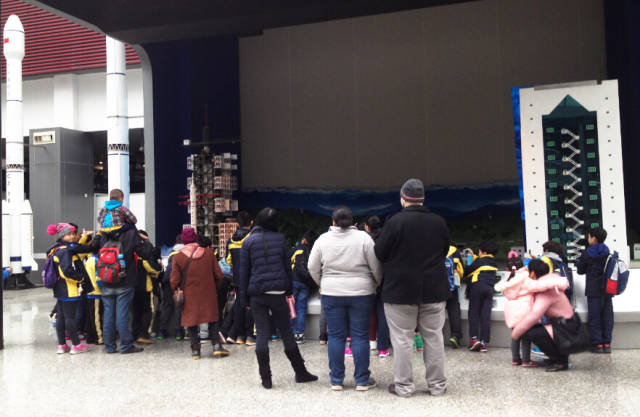 同學(xué)們一個(gè)挨一個(gè)地站在展示臺(tái)前,睜著圓溜溜的大眼睛盯著一米多高的火箭模型,生怕錯(cuò)過每一個(gè)細(xì)節(jié)。