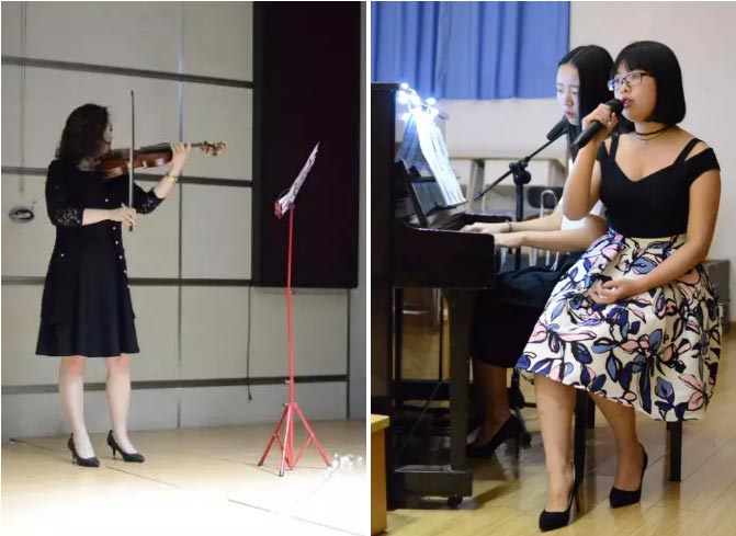 《月半小夜曲》、《年輪》、《All of Me》、《老男孩》......中文歌曲、粵語(yǔ)歌曲、英文歌曲輪番上陣。獨(dú)唱,合唱,更有師生二重奏配樂(lè)演唱......
