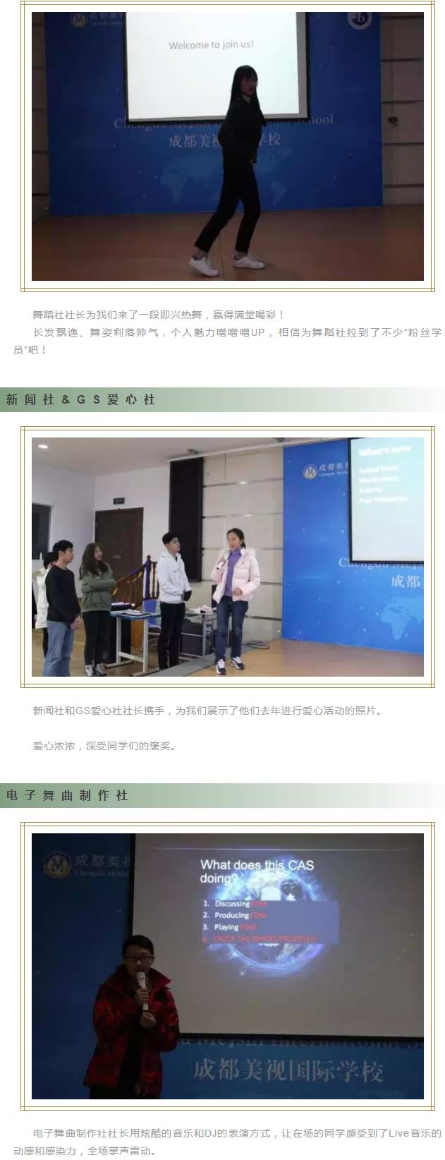 此次CAS新開(kāi)展的活動(dòng)有:戲劇社,舞蹈社,新聞社,電子音樂(lè)制作社,錄音社,還有老師們組織的網(wǎng)球社棋藝社。