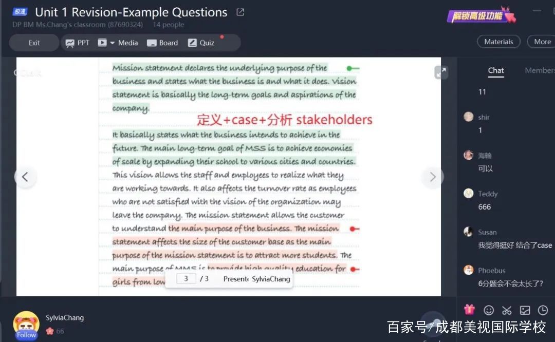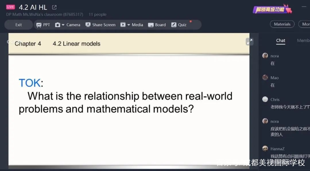 早在疫情剛開始的時候,成都美視學(xué)校融合部的領(lǐng)導(dǎo)團(tuán)隊就在研究各種應(yīng)對延遲開學(xué)的方案,考慮到IB課程沒有現(xiàn)成的網(wǎng)絡(luò)資源,5月份DP畢業(yè)生面臨全球IB統(tǒng)考,各種內(nèi)部評估等。特別是畢業(yè)生的大學(xué)申請工作更是不能怠慢,因為這正是關(guān)系到同學(xué)們海外留學(xué)之路的關(guān)鍵時刻,所以篩選出一個滿足中外籍師生需求的教學(xué)平臺就顯得尤為重要,最終經(jīng)過多方比較,調(diào)研,我們選擇了cctalk平臺進(jìn)行上課,此平臺可以提供錄播、在線直播、回放的功能,學(xué)生可以在線和老師交流互動。