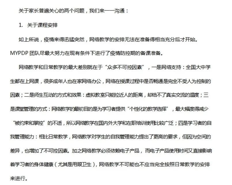 為了增加家長們對網(wǎng)絡(luò)教學(xué)要求的了解,有效助力學(xué)生的學(xué)習(xí),MYPDP團(tuán)隊成立家校工作委員會,聽取家長們的反饋和建議,及時以“答家長問”的方式進(jìn)行溝通;