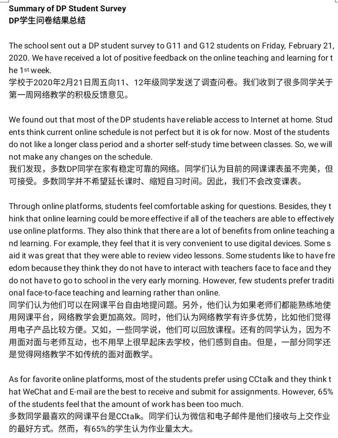 關(guān)于作業(yè)的布置,這也是一個同學(xué)家長比較關(guān)心的話題,網(wǎng)課期間,老師和學(xué)生可以通過ManageBac, CCtalk,電子郵件等方式進(jìn)行資料上傳、作業(yè)發(fā)布和提交,這兩個平臺是平時大家一直使用的,學(xué)生操作起來也較熟悉,同時,考慮到學(xué)生長時間上網(wǎng)課的用眼衛(wèi)生,各學(xué)科老師盡可能地讓學(xué)生用紙和筆的方式完成作業(yè)。