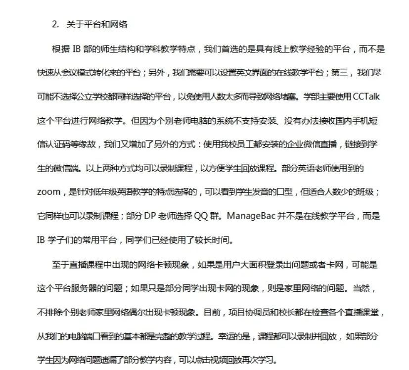 在正式開課之前,學(xué)部對學(xué)生和老師都進(jìn)行了相關(guān)平臺使用方式的培訓(xùn),以保證這個平臺的正常使用;同時,部分老師也采用了企業(yè)微信直播,將鏈接到學(xué)生客戶端的方式,學(xué)生可以選擇在線觀看直播或者觀看回放。也有部分老師選擇 QQ群微信群進(jìn)行網(wǎng)上教學(xué)??偠灾鱾€學(xué)科的老師會根據(jù)課程和學(xué)生的特點靈活尋求各種方式,讓網(wǎng)上教學(xué)發(fā)揮出最大的效果。