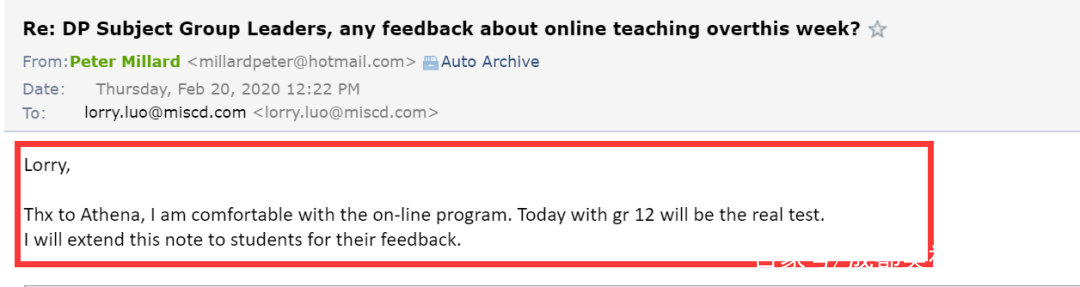 為保證在線教學(xué)質(zhì)量,校長及項目協(xié)調(diào)員要求學(xué)科老師們提交教學(xué)計劃,學(xué)生學(xué)習(xí)任務(wù)計劃,并不定時進(jìn)課堂觀摩教學(xué),并在課后和老師充分溝通,提供寶貴的建議和意見;在同學(xué)們完成在線學(xué)習(xí)任務(wù)的同時,我們的班主任、教學(xué)助理、IT老師也沒有閑著,他們?nèi)膛惆?,隨時幫助學(xué)生們熟悉各種平臺進(jìn)行答疑。
