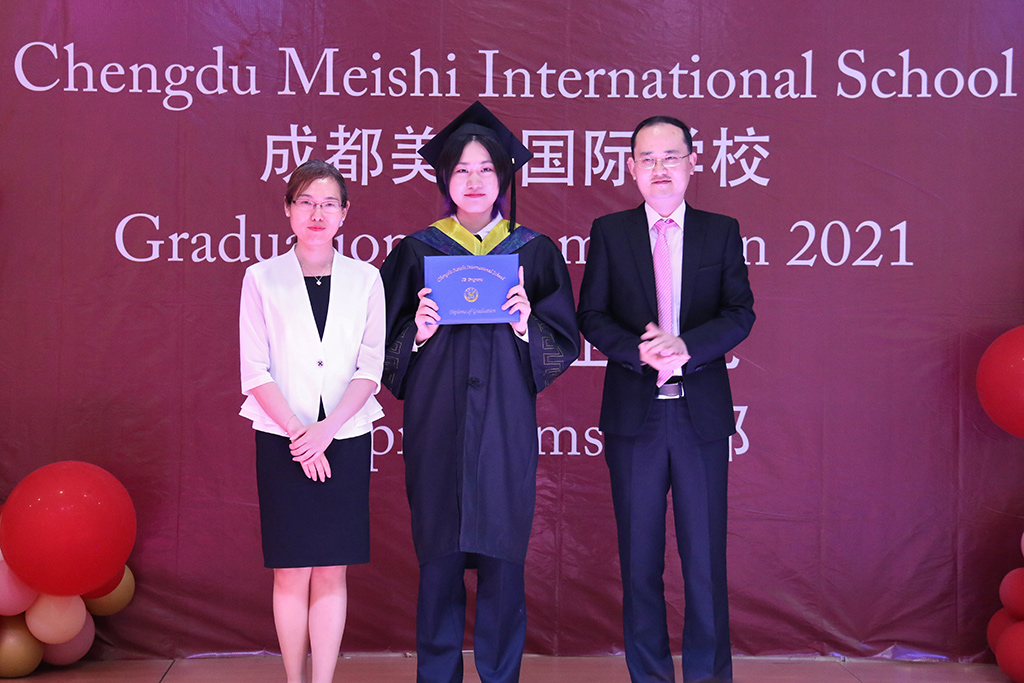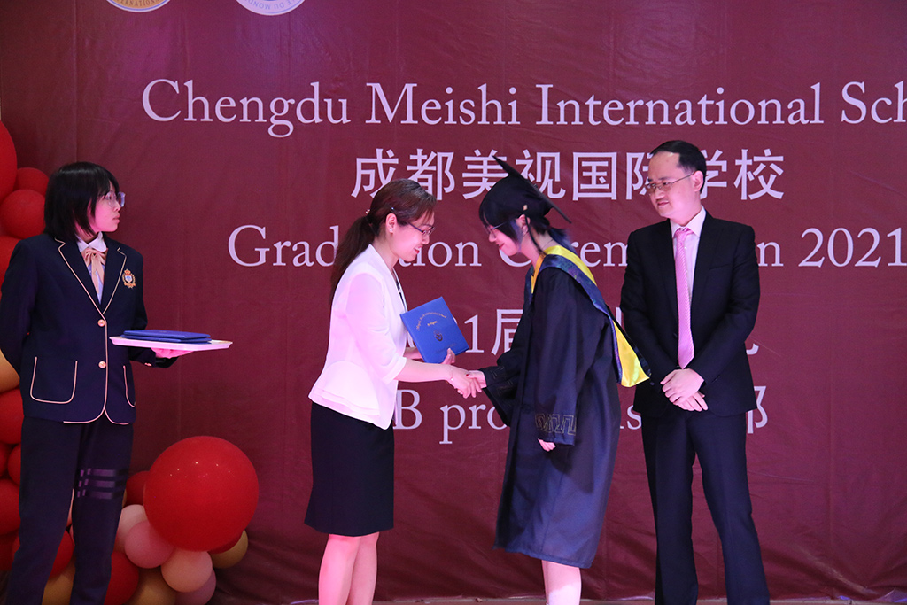 接下來IB部劉校長與DP協(xié)調員Mr.Lorry為畢業(yè)生頒發(fā)證書。劉校長代表IB部為獲得斯坦福offer的畢業(yè)生Sera頒發(fā)紀念品。