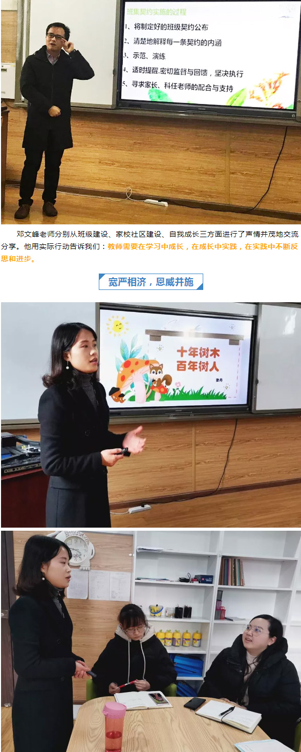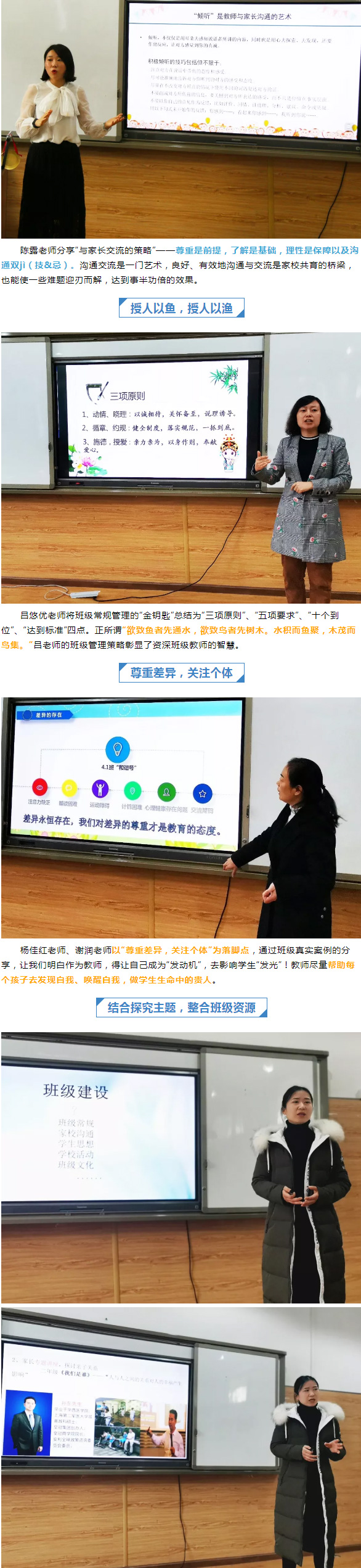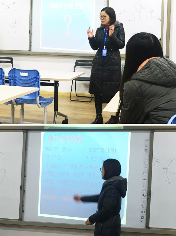 “我眼中的班主任是什么樣的?”“班主任的角色要求有哪些?”“你是哪種類型的班主任?”學(xué)習(xí)社區(qū)主任雷智菊用問(wèn)題驅(qū)動(dòng)的交流方式,引導(dǎo)老師們探討班主任的角色定位,鼓勵(lì)大家努力成為科學(xué)家型的學(xué)習(xí)者與研究者 ,要運(yùn)用科學(xué)方法“用心、細(xì)致、超前、智慧”地工作。還與老師們分享了班主任的工作重點(diǎn)應(yīng)從班風(fēng)建設(shè)、班級(jí)日常管理、個(gè)別學(xué)生診療三方面著手,字字珠璣,讓大家受益匪淺。