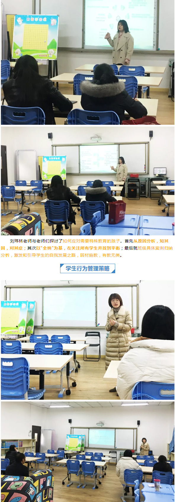 胡詩(shī)琦老師與老師們重點(diǎn)探討了面對(duì)長(zhǎng)期出現(xiàn)行為問(wèn)題的學(xué)生,可以有哪些有效的管理辦法。如何從教師自身、學(xué)生以及家長(zhǎng)三方做好反思、溝通和合作。希望通過(guò)這些方法引導(dǎo)孩子們完善自己,更加積極陽(yáng)光。