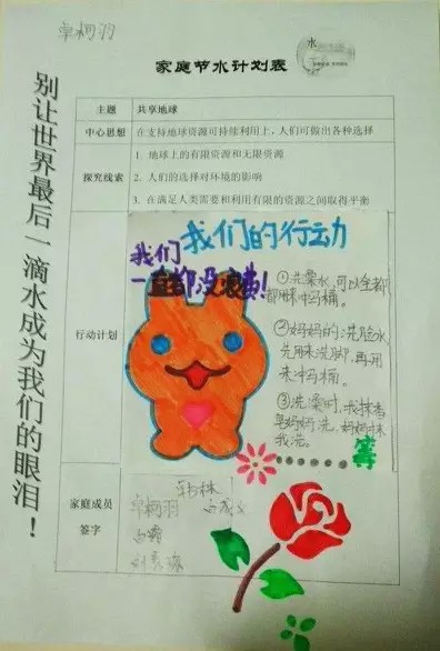 周末回到家,我們就立即旋風般行動起來!召開家庭會議,共同制定一份節(jié)水計劃,時時刻刻相互警醒......探究的成果扎扎實實地駐守在我們的價值觀和生活中,節(jié)約用水的“小種子”更在我們心中繁茂生長,并隨著春風,四處擴散發(fā)揚。