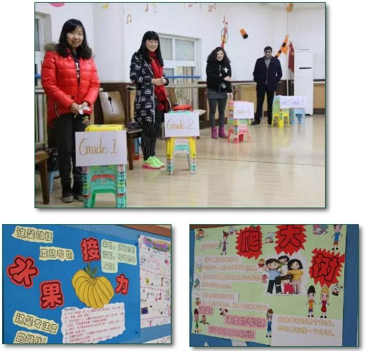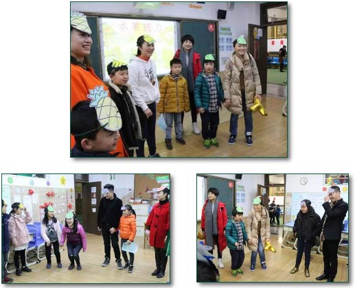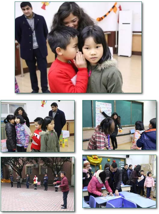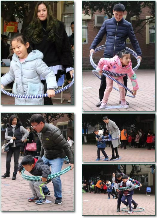 瞧,老師們早就為每個(gè)家庭精心策劃并準(zhǔn)備好了二十多個(gè)活動項(xiàng)目:“水果接力”、“爬大樹”、“瞎子摸象”、“毛毛蟲”、“青蛙入洞”、“好運(yùn)彩彈”、“巧手夾珠”、“你做我猜”、“快樂家庭巧打扮”、“開心保齡球”、“百發(fā)百中”、“火眼金睛”、“快樂傳遞”、“踏石過河”、“我是神投手”、“Chinese whisper”、“Throw the ball”……