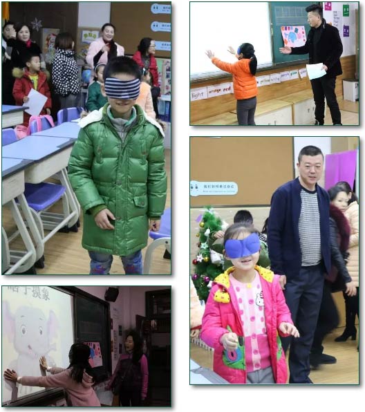 “瞎子摸象”活動處,爸爸媽媽和孩子們默契配合。