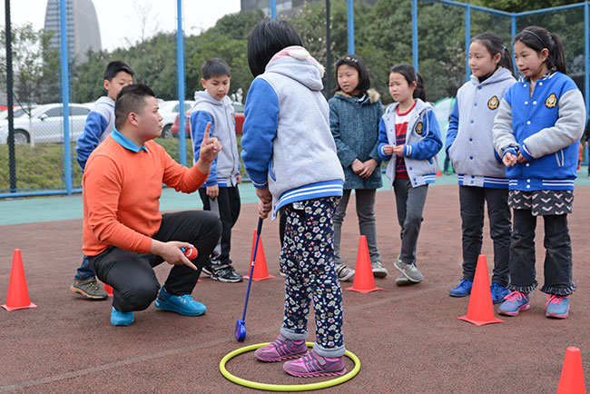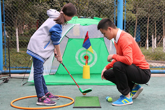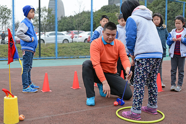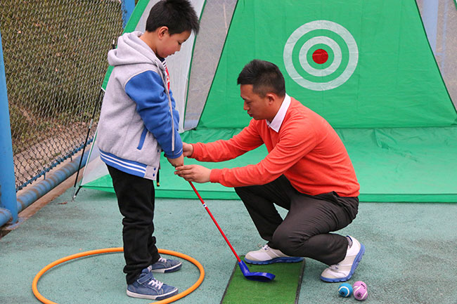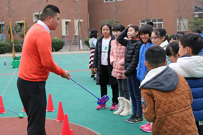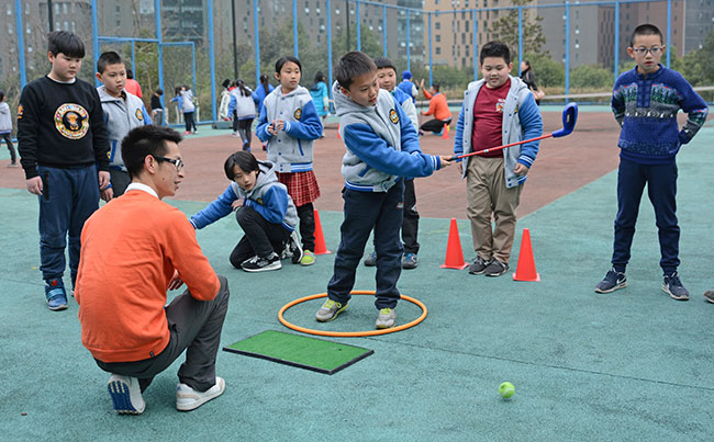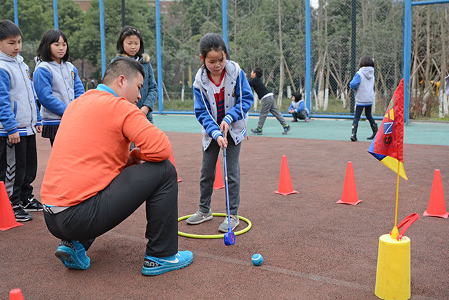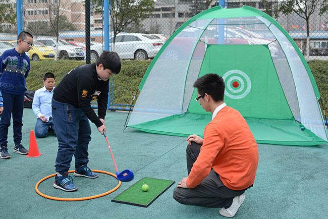 每一次的實(shí)踐課教練們都會(huì)背上重重的高爾夫運(yùn)動(dòng)器材走進(jìn)教室向各班孩子介紹相關(guān)知識(shí)。同學(xué)們不僅了解了這項(xiàng)運(yùn)動(dòng)的起源、意義、相關(guān)禮儀,還觀(guān)看了著名高爾夫球員的相關(guān)視頻,從而對(duì)這項(xiàng)運(yùn)動(dòng)更加期待。接著,孩子們來(lái)到操場(chǎng)體驗(yàn)高爾夫運(yùn)動(dòng)。教練們認(rèn)真示范,以職業(yè)球員的實(shí)戰(zhàn)經(jīng)驗(yàn)來(lái)指導(dǎo)每一個(gè)孩子。他們?nèi)诤弦惶捉】悼茖W(xué)的青少年教學(xué)體系,不僅專(zhuān)注于球技,也注重青少年運(yùn)動(dòng)技能開(kāi)發(fā),幫助孩子們?nèi)娼】党砷L(zhǎng)。教練宣布運(yùn)動(dòng)規(guī)則,每一位同學(xué)興致盎然,他們專(zhuān)心致志,積極探究。從熱身運(yùn)動(dòng)開(kāi)始,再到認(rèn)識(shí)球桿,接著教練們示范握桿姿勢(shì),每一個(gè)環(huán)節(jié)都講解得特別詳細(xì)。同學(xué)們眼中充滿(mǎn)期待,恨不得馬上可以擊出一球。
