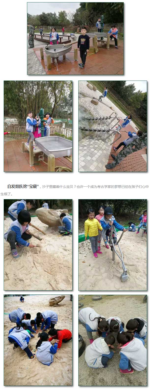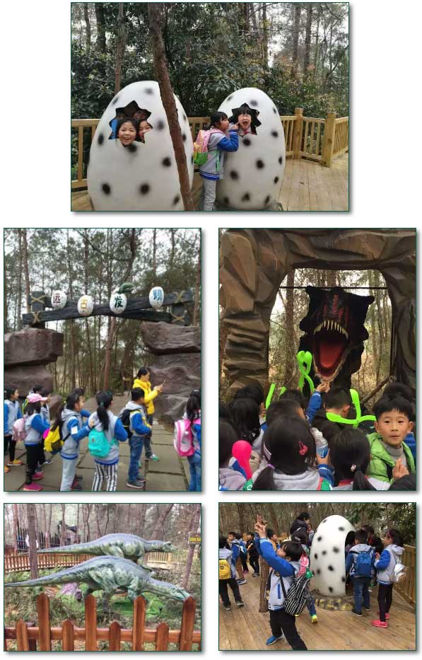瞧,林深處還有一處“遠(yuǎn)古之地”呢!那里有種類豐富、姿態(tài)各異的“恐龍”。孩子們指著指示牌上的名稱,念到“雙冠龍、偷蛋龍、三角龍”……
