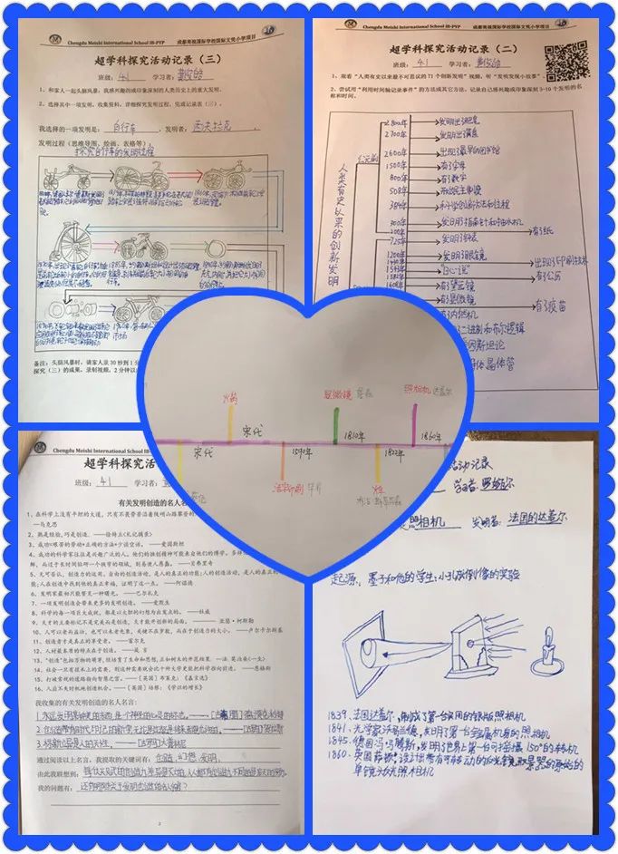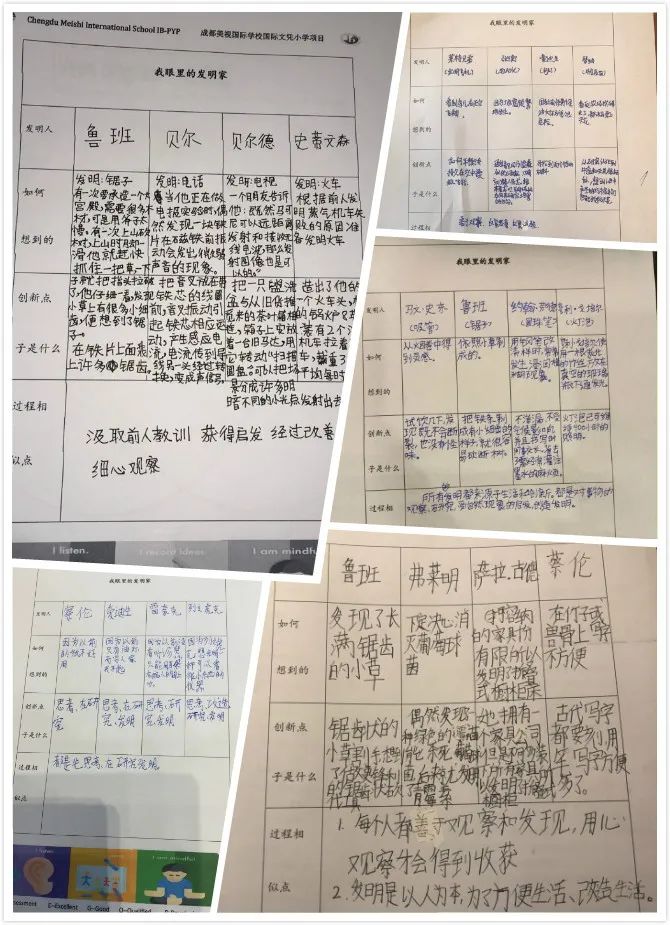 孩子們在家里閱讀了相關(guān)探究資源,帶著問題去觀看了發(fā)明故事的小視頻,通過對信息進行收集、整理,并運用韋恩圖分析、記錄,發(fā)現(xiàn)發(fā)明家的共同點---善于觀察、勤于思考,這也是我們PYP學習者十大培養(yǎng)目標中的兩點。在“高鐵的奇跡”紀錄片觀看中,孩子們感受到了:中國高鐵的每一項創(chuàng)新都經(jīng)歷了“發(fā)現(xiàn)問題、理解問題、提出假設(shè)、檢驗假設(shè)”的科學實驗過程。孩子們形成了自己的觀點,采用視頻、思維導圖、表格、圖文漫畫等各種方式分享了自己創(chuàng)新的想法或經(jīng)歷,鍛煉了自己的溝通技能和自我管理技能,練就了一雙善于觀察的慧眼。