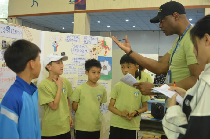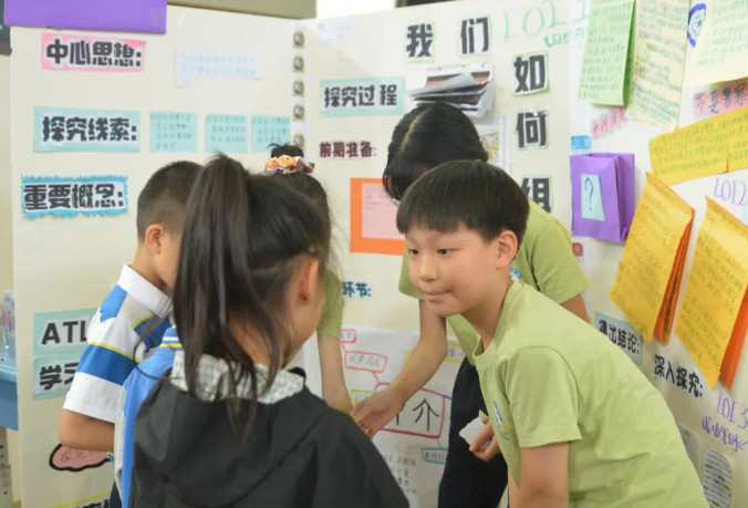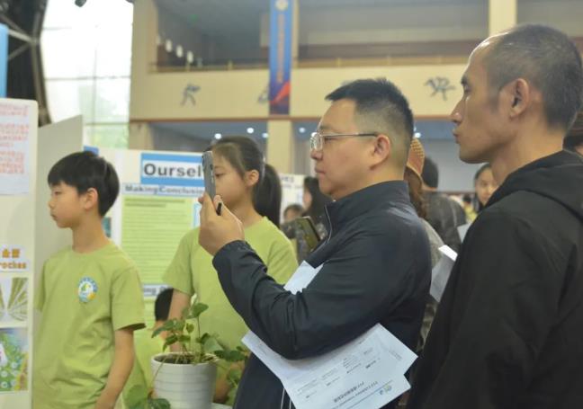 會(huì)場(chǎng)內(nèi),整齊而有序的擺放著一張張孩子們?cè)趯?dǎo)師的指導(dǎo)下精心設(shè)計(jì)的展板。孩子們站在自己設(shè)計(jì)的展板前,就像一個(gè)個(gè)小小演說(shuō)家?guī)е孕艥M滿的微笑,迎接著一波又一波前來(lái)參觀和提問(wèn)的嘉賓們。他們從容不迫,侃侃而談,用自信流利的中英雙語(yǔ),運(yùn)用多元的分享形式,或娓娓道來(lái),或深入淺出,或靈活互動(dòng),向每一位觀眾用心闡述著自己的探究成果和收獲。有感于孩子們超乎年齡的溝通、思考、演講、探究與應(yīng)變能力,家長(zhǎng)和來(lái)賓們頻頻豎起大拇指,連連稱贊,更紛紛忍不住在感興趣的展板前傾聽(tīng)、思考、欣賞并合影留念。
