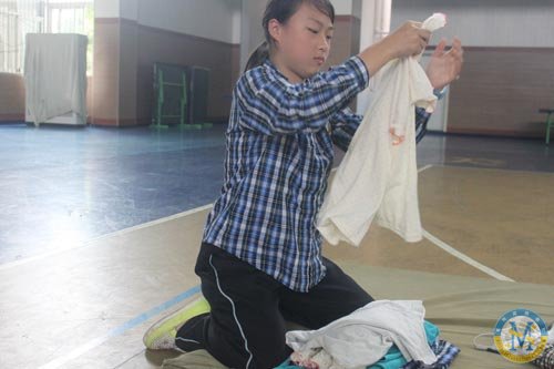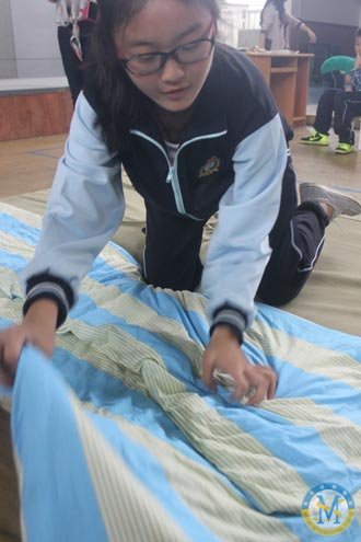 三個MYP班的同學(xué)們以班級為單位進行PK賽。在音樂聲中傳花以此來決定上臺參賽的人選。同學(xué)們要比賽系領(lǐng)帶、穿針引線縫鈕扣、最快的速度疊被子、又快又好收拾行李箱、分類整理文件資料以及生活常識小問答。