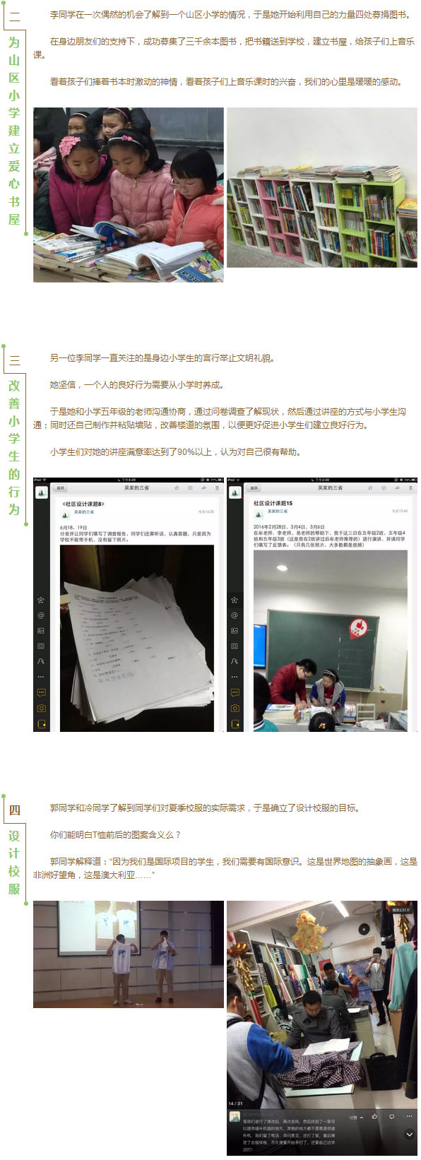 社區(qū)設(shè)計(jì)注重社區(qū)與服務(wù),鼓勵(lì)學(xué)生探索自己的權(quán)利和責(zé)任,在社區(qū)中實(shí)施服務(wù)行動(dòng)。它使學(xué)生有機(jī)會(huì)發(fā)展對(duì)各種社區(qū)中各種需要的認(rèn)識(shí),并通過(guò)服務(wù)性學(xué)習(xí)來(lái)應(yīng)對(duì)這些需要。作為對(duì)學(xué)習(xí)的鞏固,社區(qū)設(shè)計(jì)通過(guò)持續(xù)深入的探究引導(dǎo)在社區(qū)中開(kāi)展的服務(wù)行動(dòng)。社區(qū)設(shè)計(jì)可以由一個(gè)學(xué)生獨(dú)立完成,也可以由最多不超過(guò)3人的學(xué)生小組完成。