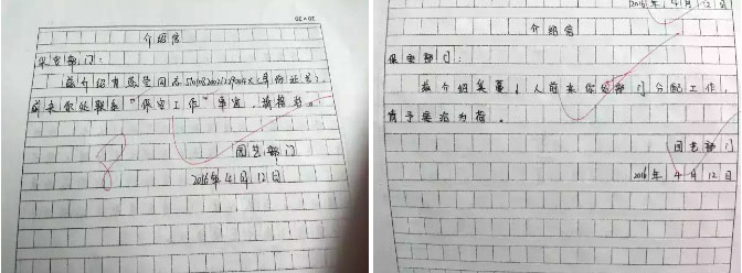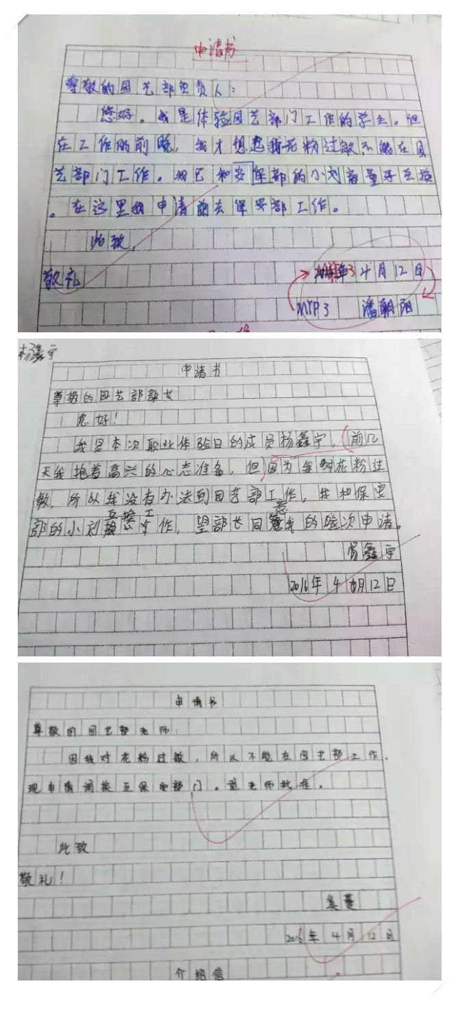 職業(yè)體驗日,你被派到園藝部工作。上班前一晚你才想起你有花粉過敏癥。于是你和保安部小劉商量互換,需要向園藝部提出申請。園藝部同意后,由園藝部開具介紹信到保安部報到。請完成申請書和介紹信的書寫。