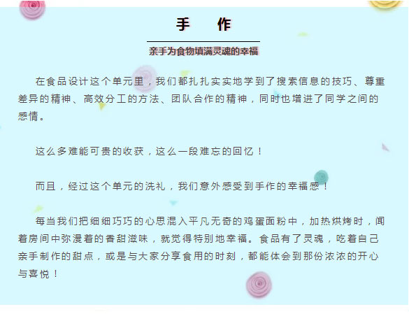 我們的作品并非完美,但同學(xué)們一直努力提升,新誕生的食品一個(gè)比一個(gè)美味可口。對(duì)了,老師們都超級(jí)捧場(chǎng),很愛吃我們做的食品哦!