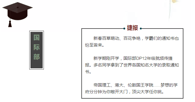 此后三個月,國際部的畢業(yè)生們將陸續(xù)收到來自各國的錄取通知書。承載著多年寒窗和夢想的一紙Offer,為同學(xué)們帶來了一個萬象更新的早春。