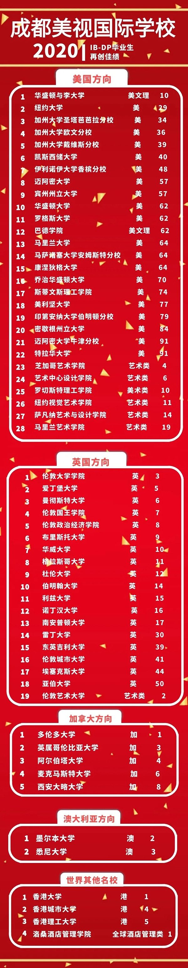 成都美視學(xué)校自2008年開辦IB-DP班至今,共畢業(yè)數(shù)屆學(xué)生。畢業(yè)生全部被美、英、加、澳等一流大學(xué)所錄取。美國圣母大學(xué)、加州大學(xué)洛杉磯分校、南加州大學(xué)、英國倫敦大學(xué)學(xué)院、帝國理工學(xué)院、倫敦政經(jīng)學(xué)院、愛丁堡大學(xué)、加拿大多倫多大學(xué)、麥吉爾大學(xué)、英屬哥倫比亞大學(xué)、澳大利亞國立大學(xué)、墨爾本大學(xué)、悉尼大學(xué)、日本早稻田大學(xué)等國際著名大學(xué)皆不乏美視學(xué)子身影。