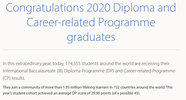 據(jù)國(guó)際文憑組織IBO官網(wǎng)公布的消息,今年全球共有174,355名學(xué)生取得了IB文憑,平均分為29.9分。有140名學(xué)生(0.08%)獲得了45分的滿分。其中,6240名學(xué)生獲得了40分以上的高分,全球DP通過率約為78.75%。