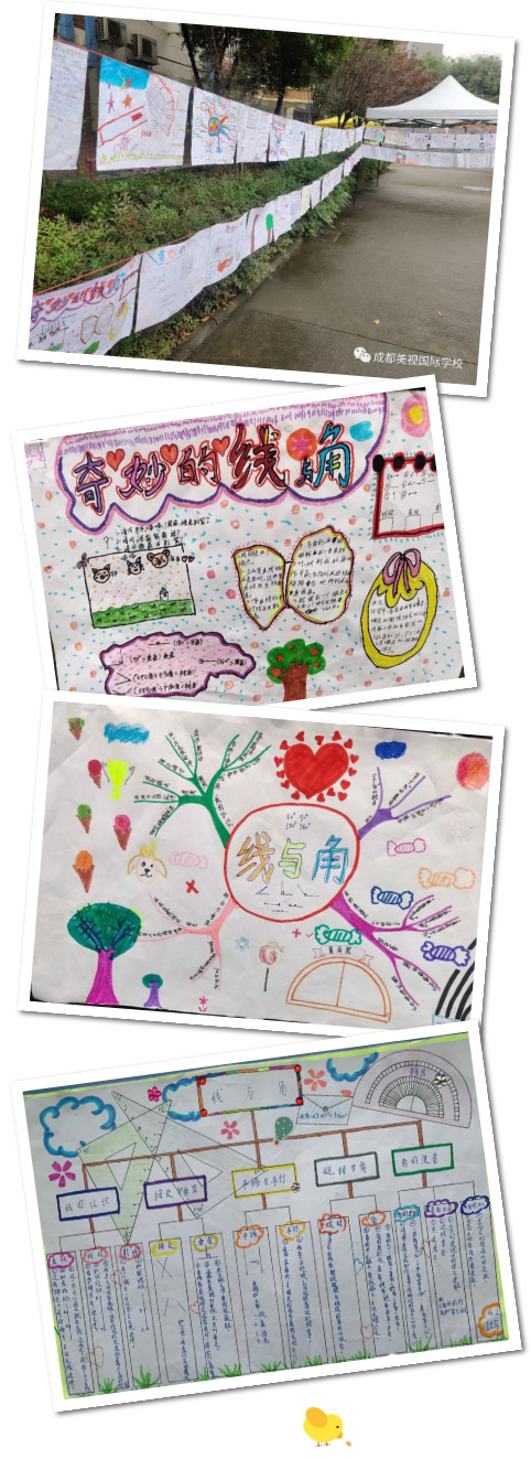 點(diǎn)動(dòng)成線,線動(dòng)成面,面動(dòng)成體。平面幾何與立體幾何都離不開“線與角”這些基本的幾何元素。四年級的小朋友充分展示了他們的數(shù)學(xué)歸納能力,將知識點(diǎn)生動(dòng)有趣地展現(xiàn)在小報(bào)上。