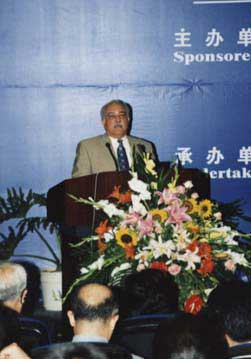 美國(guó)加利福利亞州前州長(zhǎng)、前美國(guó)國(guó)會(huì)議員、加州州議會(huì)侯任議長(zhǎng)Mervyn Dymally博士在研討會(huì)上。他演講的題目是:“即使到了Internet時(shí)代,留學(xué)生依然不能忘記自己的文化。”