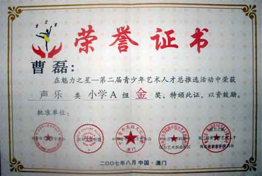 曹磊同學(xué)在魅力之星—第二屆青少年藝術(shù)人才總推選活動(dòng)中榮獲聲樂(lè)類小學(xué)A組金獎(jiǎng)(08/07)