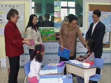 成都市委、市政府副秘書長(zhǎng)李寧參觀融合部教室,與學(xué)生親切交談。
